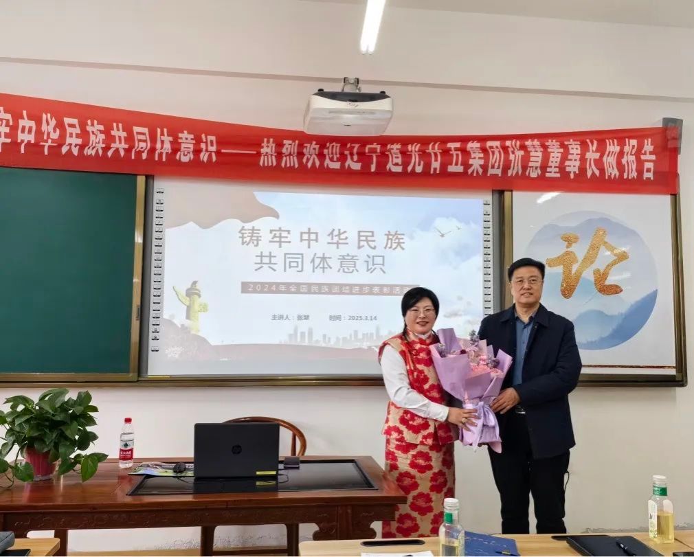 为深入学习贯彻习近平总书记关于加强和改进民族工作的重要思想,营造铸牢中华民族共同体意识教育的浓厚氛围,引导广大师生深入理解中华民族共同体的深刻内涵,培养同学们的爱国情怀、增强民族凝聚力。近日,我校在颂贤楼502教室举办铸牢中华民族共同体意识专题讲座,辽宁道光廿五集团董事长张慧女士作为特邀嘉宾,为师生带来了一场兼具理论深度与实践案例的精彩宣讲。我校党委书记、校长陈建军,副校长崔宝秋,锦州师专特聘研究员、东北大学东亚研究院辽西分院院长梁晓东出席活动,文学院领导与部分师生共同参加了此次活动。