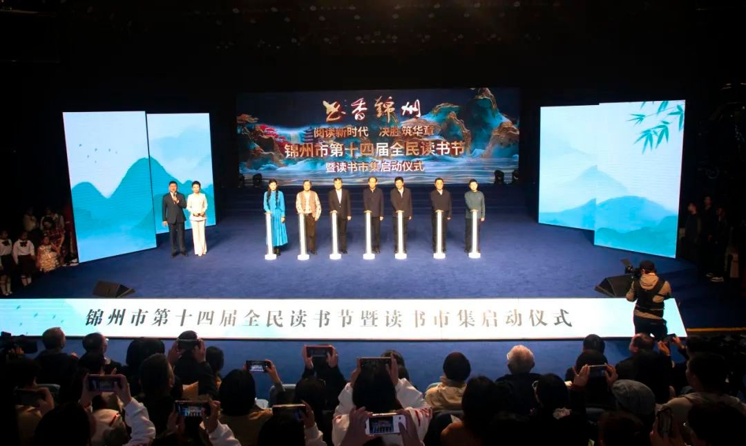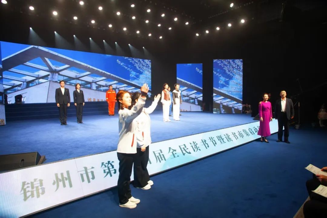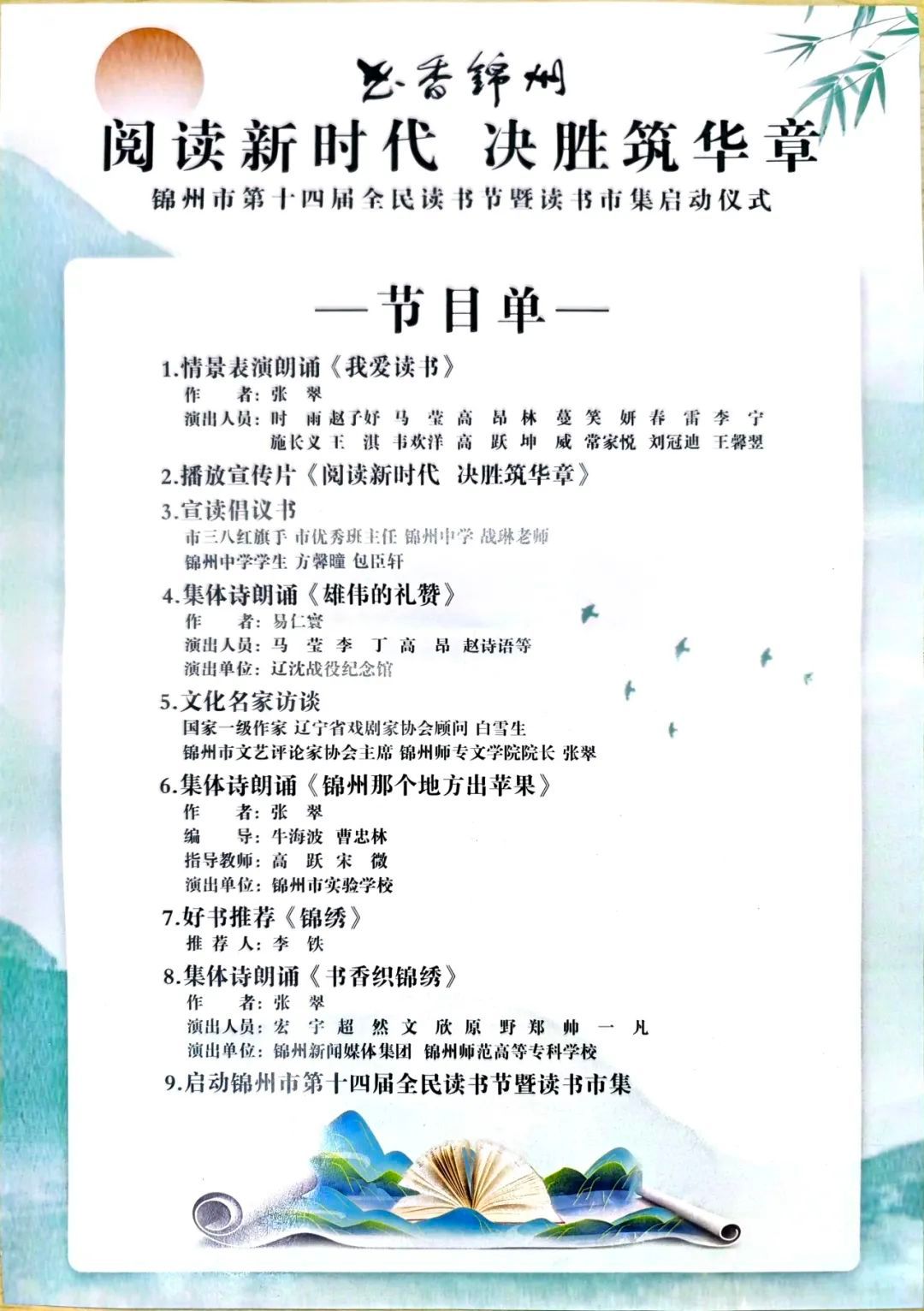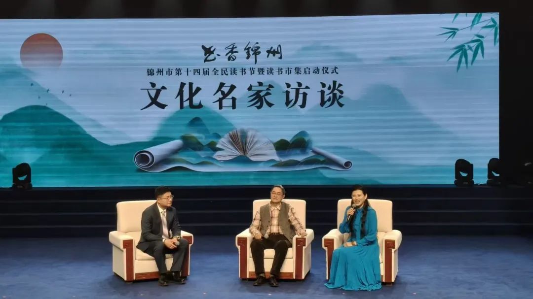 启动仪式上播放了宣传片《阅读新时代 决胜筑华章》。来自全市各条战线的领读人通过读书倡议、阅读分享、诗歌诵读等方式,品味文字魅力,抒发阅读喜悦,引领读书风尚,凝聚精神力量。现场邀请国家一级作家、辽宁省戏剧家协会顾问白雪生,锦州市文艺评论家协会主席、我校文学院院长张翠教授进行文化名家访谈。推介《光耀杯》一等奖、入选“中国好书”的李铁中国工业文学作品《锦绣》作为推荐阅读书目。仪式上《我爱读书》、《锦州那个地方出苹果》、《书香织锦绣》等朗诵作品均由我院张翠教授创作,作品紧扣时代脉博和书香主题,营造“烟火书香”新场景。