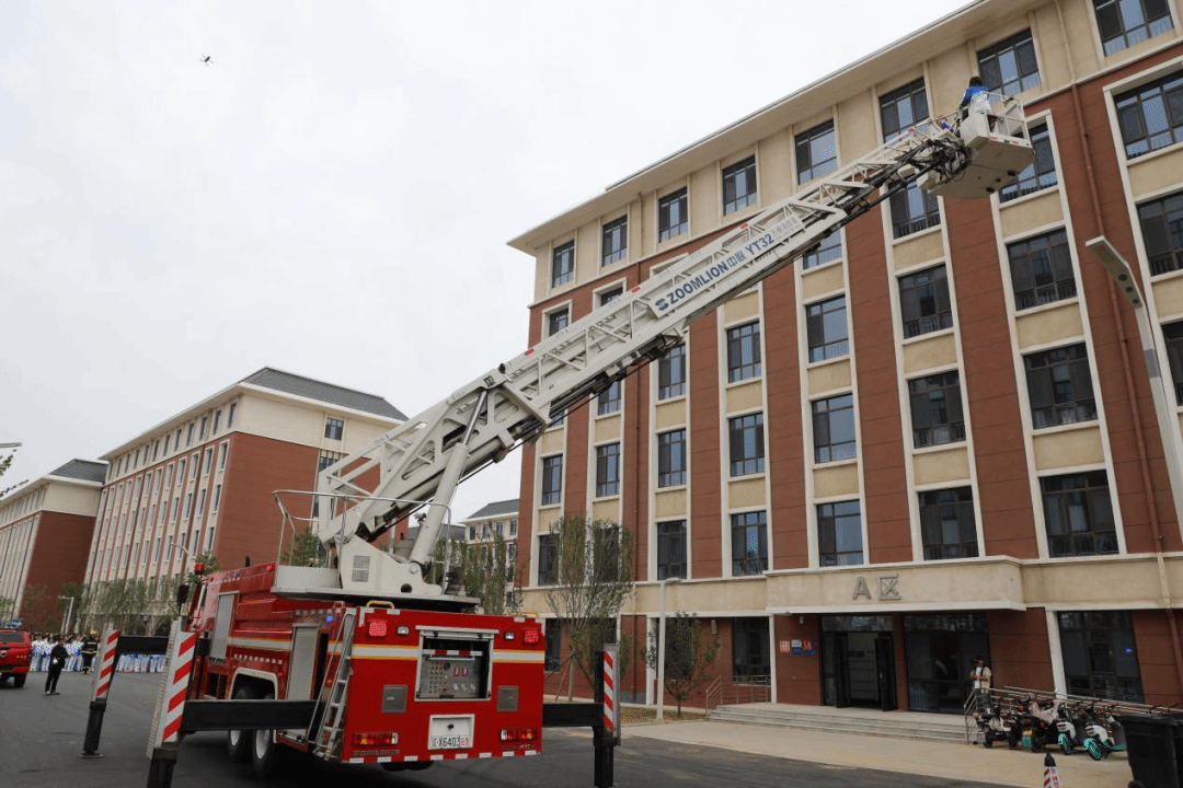 随着总指挥宣布演练开始,学生公寓5号楼燃放烟雾弹模拟火情,触发烟感报警系统,警报拉响,校园应急指挥中心迅速拨打“119”报警电话,驻地消防救援大队接到火情后,迅速赶到现场,火灾现场工作人员迅速赶往火灾现场并利用灭火器、墙壁消火栓等组织扑救,公寓楼值班员迅速发出火情警报,并组织楼内人员进行疏散逃生。楼内学生接到火情疏散指令后,立即使用湿毛巾、湿手绢等捂住口鼻,在观察周围火情态势确保安全后,选择弯腰沿疏散通道迅速撤离至室外安全地域。在救援过程中发现有六名学生被困5层一寝室中,消防人员迅速启动云梯救援预案,利用云梯救援车将受困5层同学安全救出,通过再次确认人数,公寓学生全部安全疏散到指定区域,整个演练过程模拟实战,各环节紧密衔接,实用性极强,达到了预期效果。