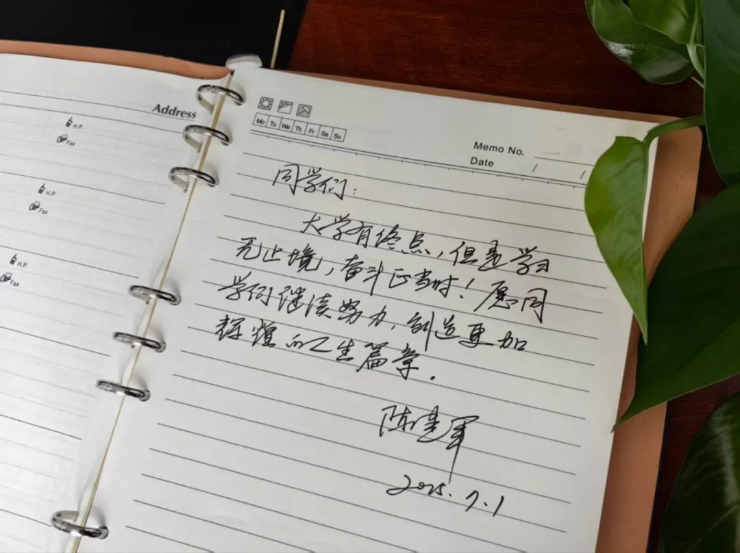 陈建军在毕业留言册上为同学们送上寄语:“同学们,大学有终点,但是学习无止境,奋斗正当时!愿同学们继续努力,创造更加辉煌的人生篇章!”