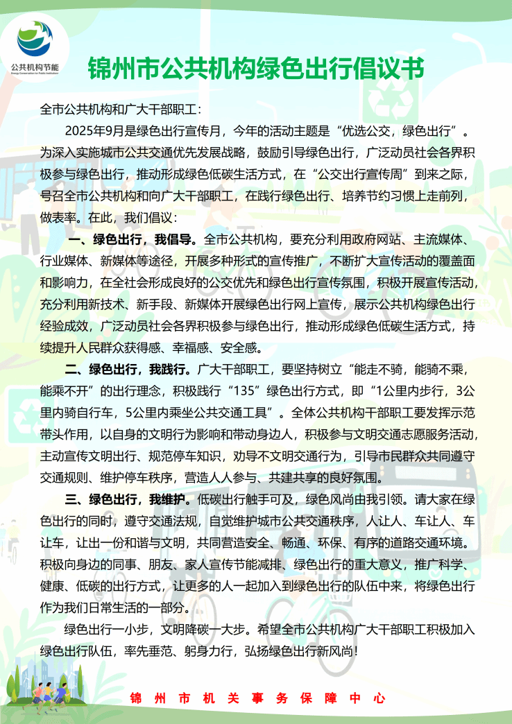 同时,我校面向全校发布《锦州市公共机构绿色出行倡议书》,号召党员干部和教职工发挥模范作用,积极践行并带动家庭、社会共同参与,引领绿色文明出行新风尚。