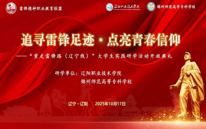 2025年10月17日,“追寻雷锋足迹 点亮青春信仰”——“重走雷锋路(辽宁线)”大学生实践研学活动在辽阳职业技术学院正式启动。锦州师范高等专科学校与辽阳职业技术学院共38名师生代表齐聚一堂,共同开启以传承雷锋精神为核心的实践研学之旅,共同追寻雷锋足迹,传承榜样力量。