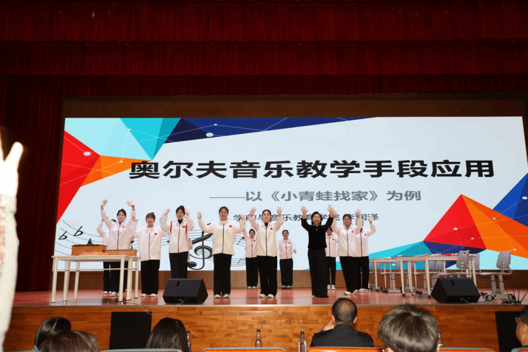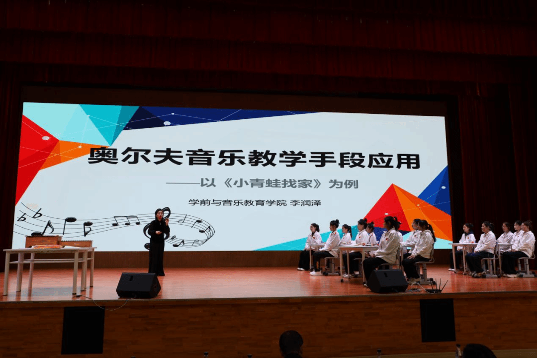 学前与音乐教育学院李润泽老师讲授《奥尔夫音乐教学法——奥尔夫音乐教学手段应用 以“小青蛙找家”为例》一课。从复习旧知《让我们围个圈》入手,过渡到新课讲授,以《小青蛙找家》为载体,讲解奥尔夫节奏型、多声部配合等专业知识。通过视频观摩、实物展示、分组实践等方式,引导学生掌握声势、游戏、打击乐器三大奥尔夫教学手段。