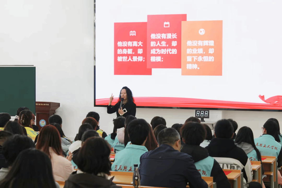 佟艳教授以“家国情怀”为核心主题,构建了“何为家国情怀—雷锋有怎样的家国情怀—如何培育家国情怀”的清晰逻辑链条,为全场师生呈现了一堂高质量的示范课。课堂上,佟教授通过生动讲述雷锋扎根岗位、奉献社会的感人故事,让“家国情怀”从抽象概念变得可感可知;通过带领大家诵读《雷锋日记》中的经典片段,从“把有限的生命投入到无限的为人民服务中去”等质朴文字里,挖掘雷锋精神中蕴含的爱国热忱与责任担当;最后围绕“新时代大学生如何培育家国情怀”展开深度解读,提出要将个人理想与国家发展、职业追求与社会需求相结合,为课程教学提供了明确思路指引。理论讲解层层递进、深入浅出,让线上线下近千名师生对雷锋精神的时代价值与教学融入路径有了更深刻的认识。