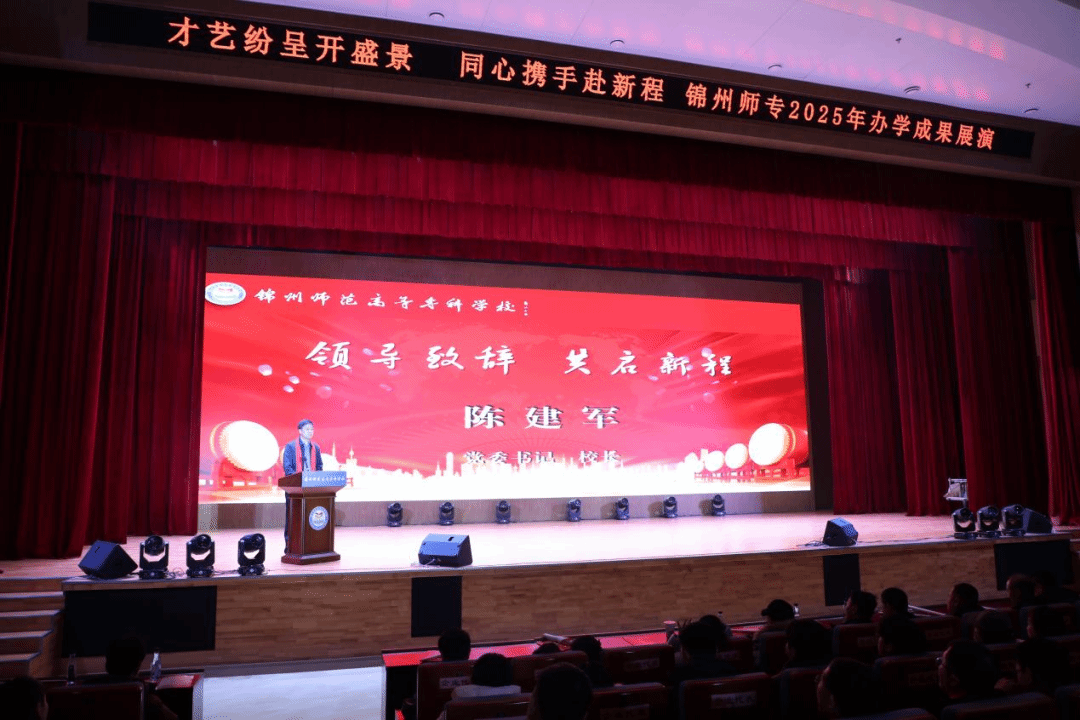 序幕拉开,我校党委书记、校长陈建军在致辞中向长期关心支持学校发展的锦州市委、市政府,市委教育工委、市教育局,各市直部门及合作企业致以衷心感谢,并从学校发展、社会影响、对外交流、校地校企融合等方面介绍我校2025年办学成果。陈建军表示,学校将持续深化教育教学改革,增强服务区域能力,为辽宁全面振兴贡献力量。讲话最后,他向全体与会嘉宾、师生员工致以新年祝福。