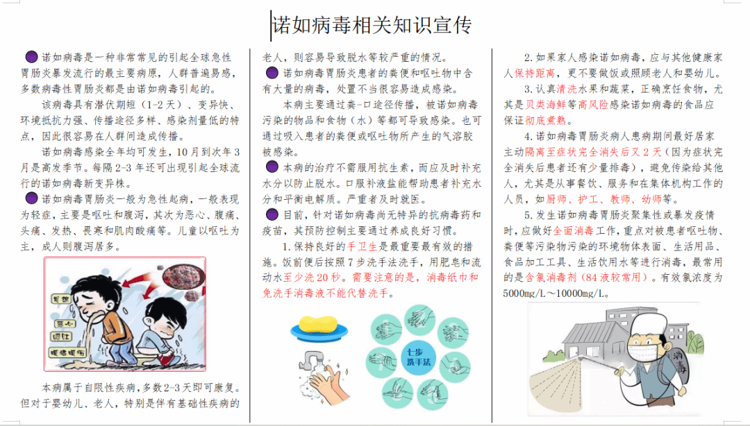 本病是自限性疾病,多数2-3天即可康复。本病无特效药和疫苗,重在预防。勤洗手(7步洗手法,流动水)。患者居家隔离至症状完全消失后又两天。与患者保持距离。清洗水果和蔬菜,正确烹饪食物,贝类海鲜彻底煮熟。疫情区域全面消毒,被患者呕吐物、粪便污染的环境和物体表面要消毒。可使用含氯消毒剂(84液较常用)。有效氯浓度为5000mg/L~10000mg/L。