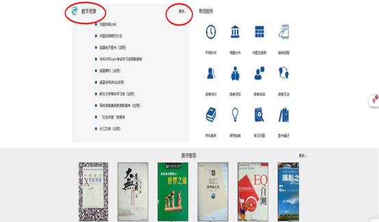 2.请点击图书馆主页菜单导航栏“数字资源”或中间的“数字资源(更多资源……)”进入电子资源平台。