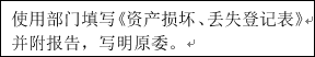 第二十一条 发现资产丢失时,应保护好现场,立即报告保卫处或上级有关部门。当事部门要填写《资产丢失登记表》。学校保卫处要迅速组织查明原因,提出处理意见,由当事部门将丢失清单和保卫处处理意见交给党政办公室(资产管理办公室)。