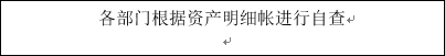 党政办公室(资产管理办公室)负责提供各部门资产明细账,各部门根据资产明细账进行账实自检,并核对资产卡片。自检完成后,将自检结果上传到党政办公室(资产管理办公室)。