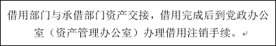 第十三条 因工作需要借用低值耐用设备时,借用部门要填写“设备借条”,并由借用部门的主管校长、部门负责人、管理员分别签字,报党政办公室(资产管理办公室)备案。在借用期间,设备由借入部门妥善保管,用完后及时归还。