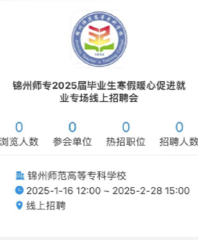 2.学校于2025年1月16日——2月28日不间断举办“锦州师专2025届毕业生寒假暖心促进就业专场线上招聘会”,请各学院组织学生参加此次招聘活动。参会同学自行扫码即可参加招聘活动。