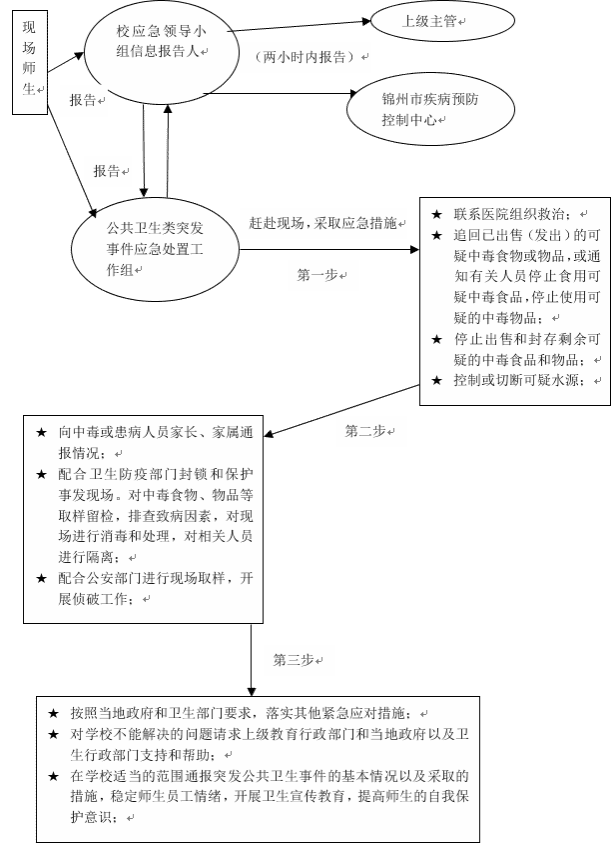 学校校园安全应急领导小组主要职责:锦州市委、市政府统一领导下,全面负责处理学校各类突发公共事件的应急响应行动,下达应急处置工作任务;在预测将要发生和已经发生突发公共事件时,启动突发事件应急预案,并开展应对突发事件的组织指挥;在处理突发公共事件过程中,协调与校外相关部门和单位的关系;当突发事件超出学校处置能力时,依程序向省委省政府、省教育厅及相关部门报送,请求指示与支援;决定信息报送省委省政府、省教育厅及相关部门的标准、内容以及请示上级部门指示、支援等事项;决定对外公布、公开与事件有关信息的口径及发布时间、方式等;部署和总结学校年度突发性公共应对工作。