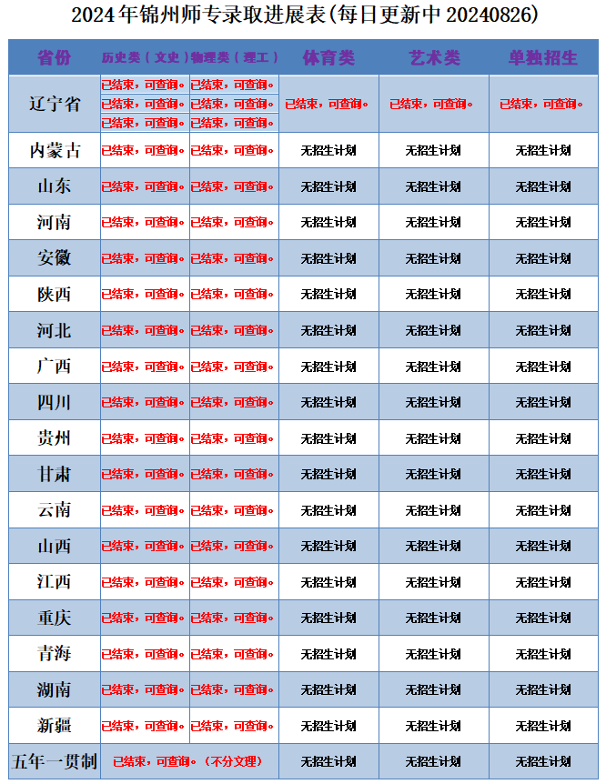 我校2024年招生录取工作正在有序进行中,我校在辽宁、河北、安徽、江西、山东、湖南、广西、重庆、贵州、甘肃、山西、内蒙古、河南、四川、云南、陕西、青海、新疆18个省、市、自治区招生,各批次录取工作将根据各省级高校招生委员会办公室安排进行,录取结果将陆续公布,请广大考生和家长持续关注我校招生网和锦州师专迎新网,第一时间获取录取进展。