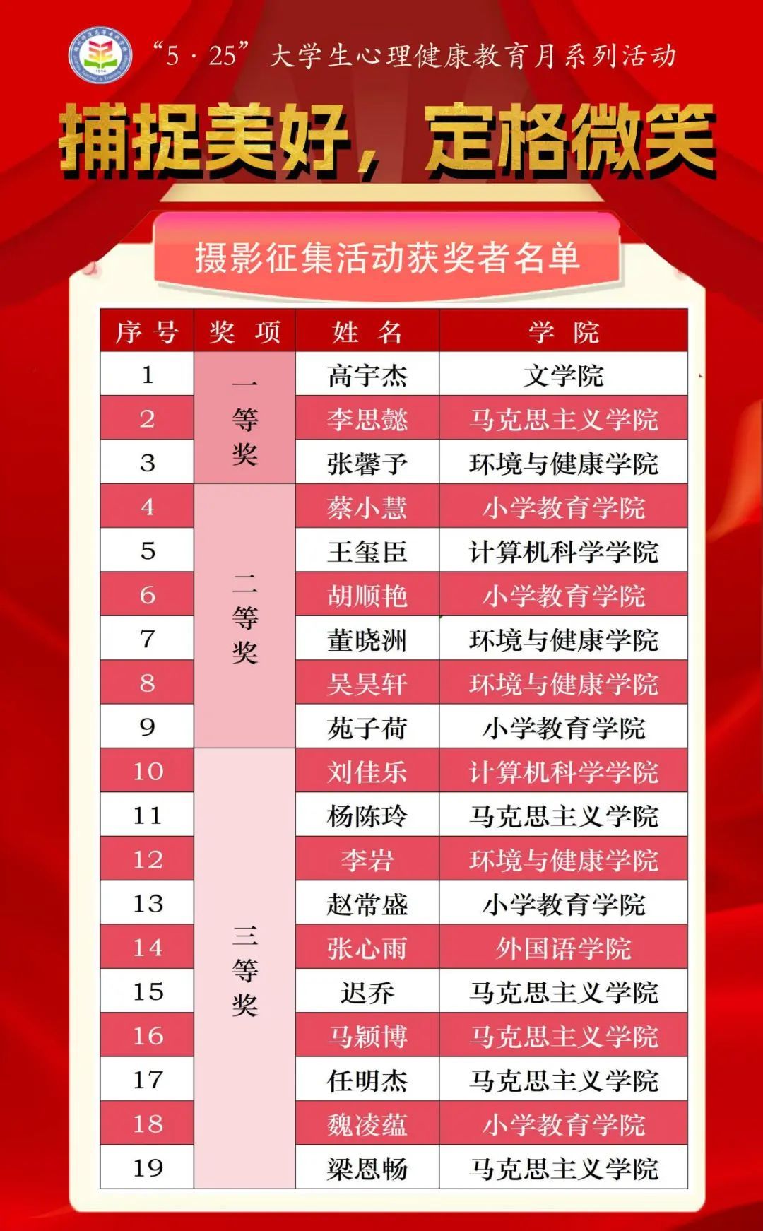 镜头是捕捉光影的笔,也是照见心灵的窗口。为展现春季校园的美好景象和师生积极向上的良好风貌,我校组织开展了以“捕捉美好,定格微笑”为主题的摄影作品征集活动,鼓励大家拿起相机记录生机盎然的校园春景及校园活动中学生的最美笑容,用镜头捕捉心灵光影,展现心理健康之美。