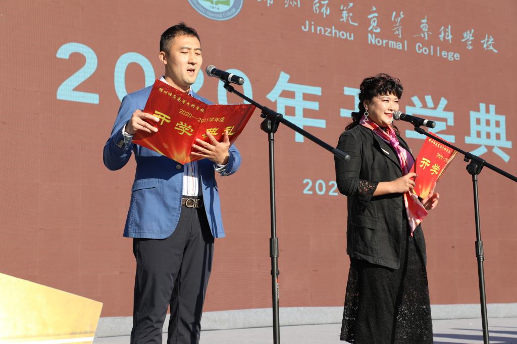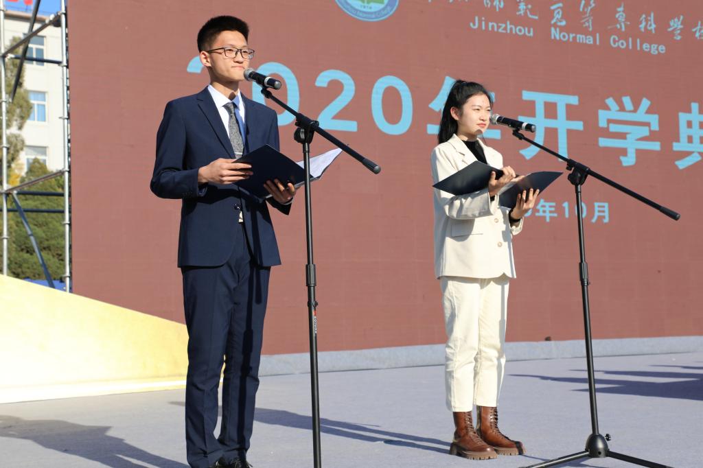 开学典礼上,英语系教师齐若琳、小学教育系辅导员姚璐作为教师代表发言,中文系学生谷剑忠代表老生发言,小学教育系孙睿代表新生发言。