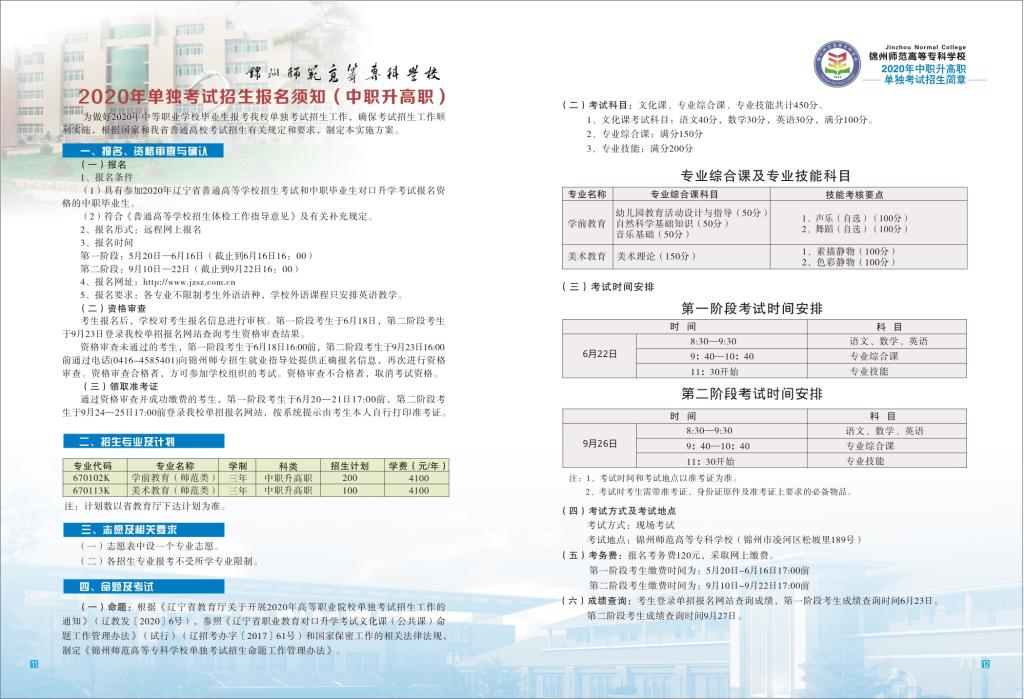 锦州师专2020年中职升高职单独考试招生简章